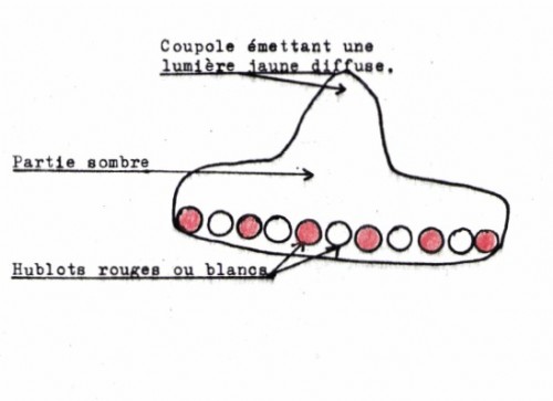 On January 12, 1989, a woman at the wheel of her car observes with approximately 30 meters with the top of the marshes an “enormous” cylindrical form comprising at the top a cupola emitting a yellow light and a series of red luminescent port-holes and white at its base. With its passage, the object disappeared and reappeared a few seconds later much higher in the sky. The observation lasted a total of only a few seconds. The investigations did not make it possible to collect other information nor to identify the phenomenon.
