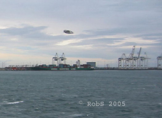 Rob RS: It's not fake. Unless my camera did something I don't know about. The pic was taken on a canon digital 3.1 megapixel camera. The setting was at Automatic. I was taking a picture of the boat in the back ground, the China shipping lines boat. When I took the picture there was nothing in the air, I didn't even know I had the object in the pic until I came home a week later and went through my pictures, and I was like...."what is that??"