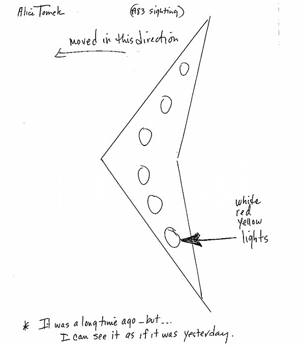 Appearance / Description of Object(s)Large triangular shape very dark in color. Size of Object(s)It had to be approximately 3 football fields wide, it seemed huge. Distance to Object(s) & AltitudeMaybe what a small plane would fly. Not very high. Description of Area / Surroundingsvery rural, reservoirs. Can sighting be explained as any conventional man-made or natural object?I don't think so. We were trying to figure out what it was, and that's why we followed it. Views on UFOs, before and after sightingI think that there has to be something other than us out there. I was told of a different type of sighting from a gentleman once, and was scared by what he tole me. Other CommentsI often think about what that was that I saw and wish I knew. Reported Sighting?NoName:Alice TomekYour Location:Gloversville, NY USA |